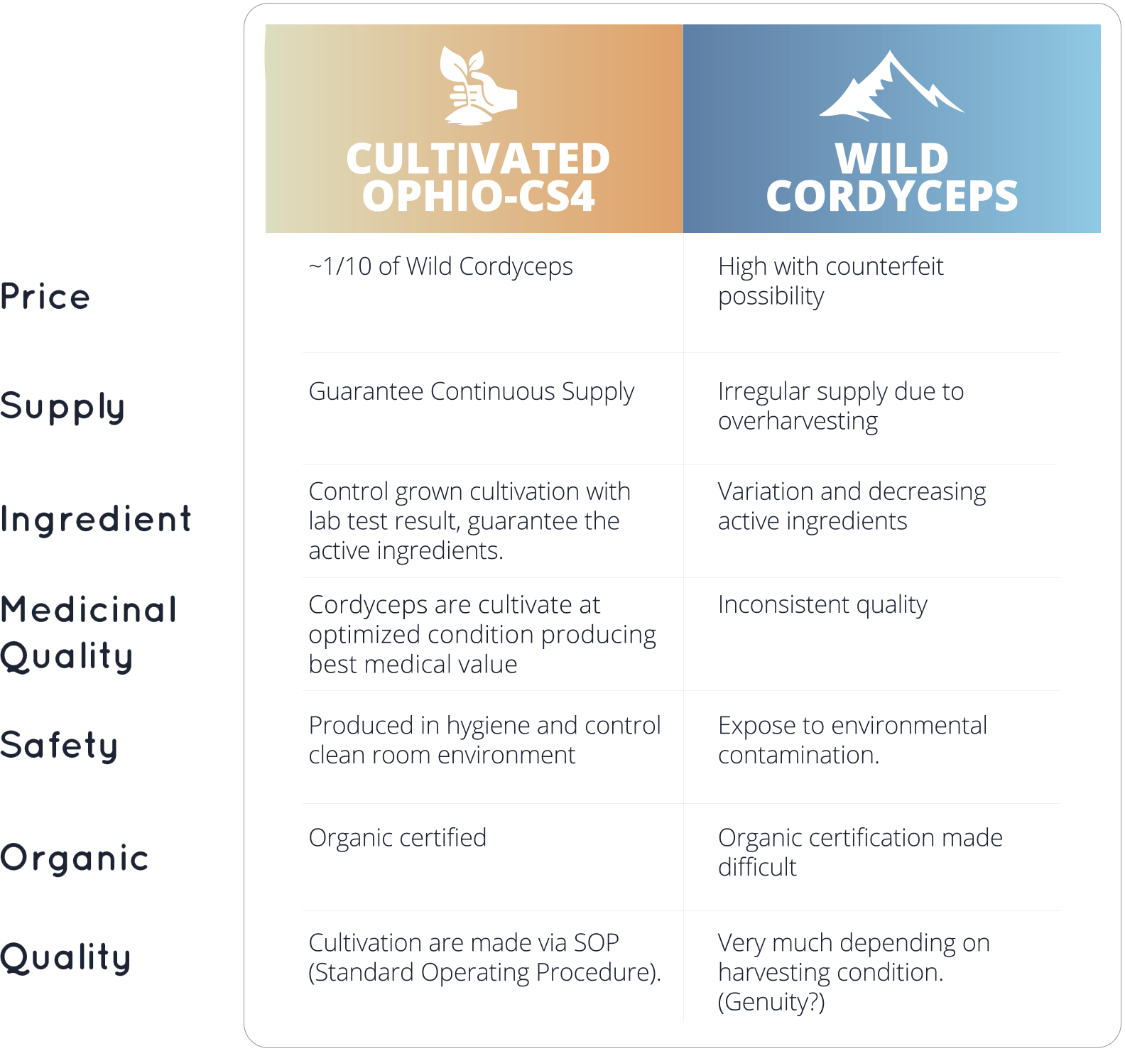 - Cultivating process by replicate an unique growth conditions that are geographically authentic to the natural habitat of wild cordyceps to obtain the finest & similar cordyceps harvest from Himalaya Mountain.